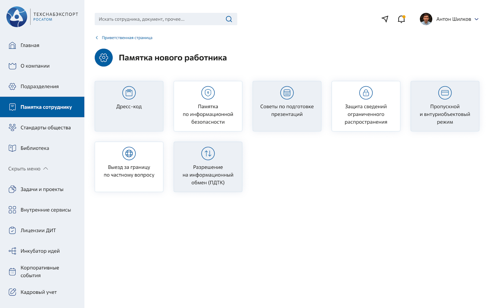 Приветственная страница. С нее пользователь сразу может перейти в один из двух разделов памятку для нового работника или получить информацию об основных бизнес-процессах. Оба разделы актуальны для новых сотрудников, а их расположение на главном экране помогает им сразу погрузиться в знакомство с работой.