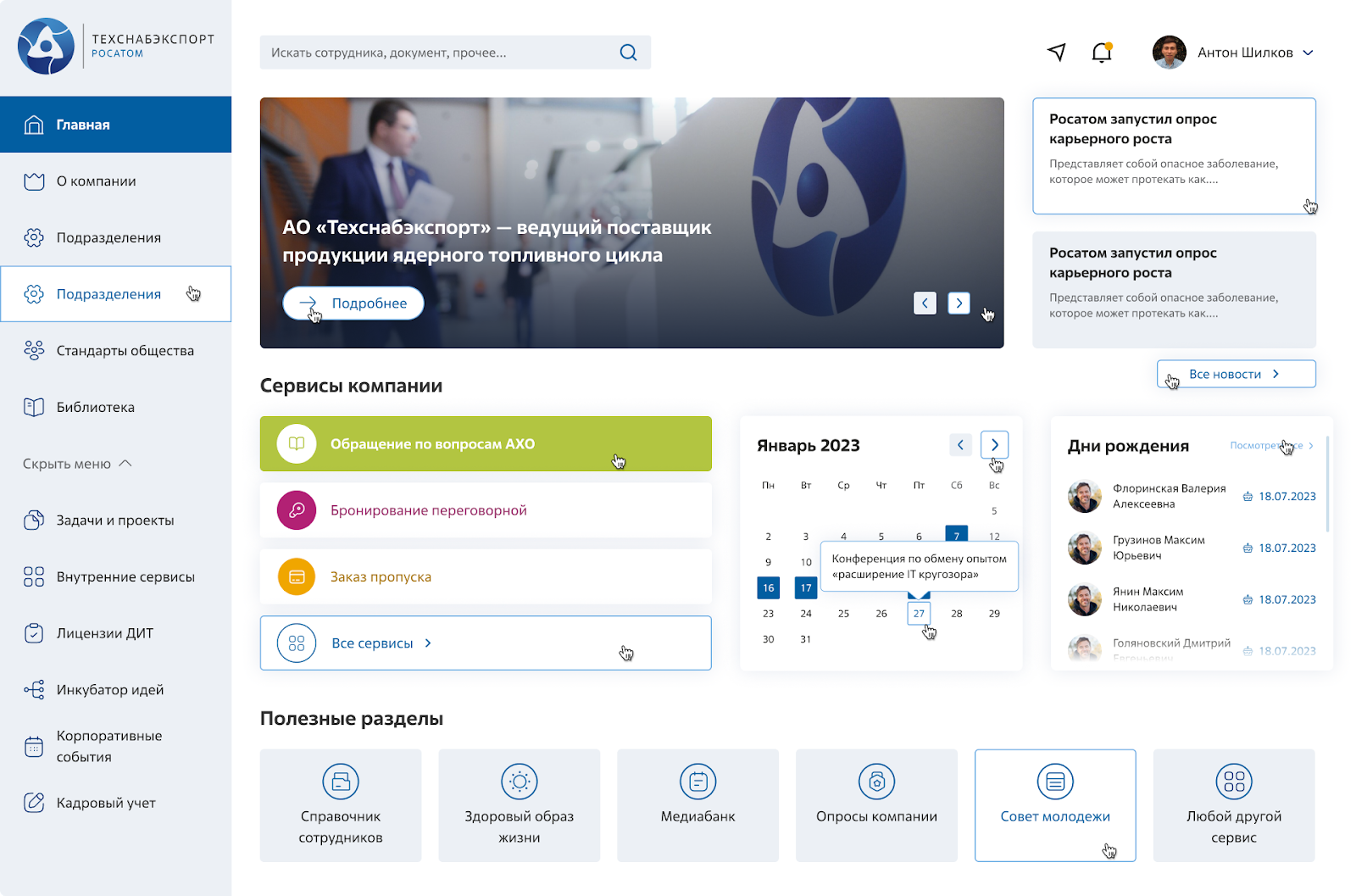 Главная страница. На главную страницу портала вывели наиболее актуальные блоки – календарь событий, основные сервисы, последние новости и пр. Сделали навигационное меню более заметным, чтобы пользователь быстрее мог перейти в интересующий раздел.